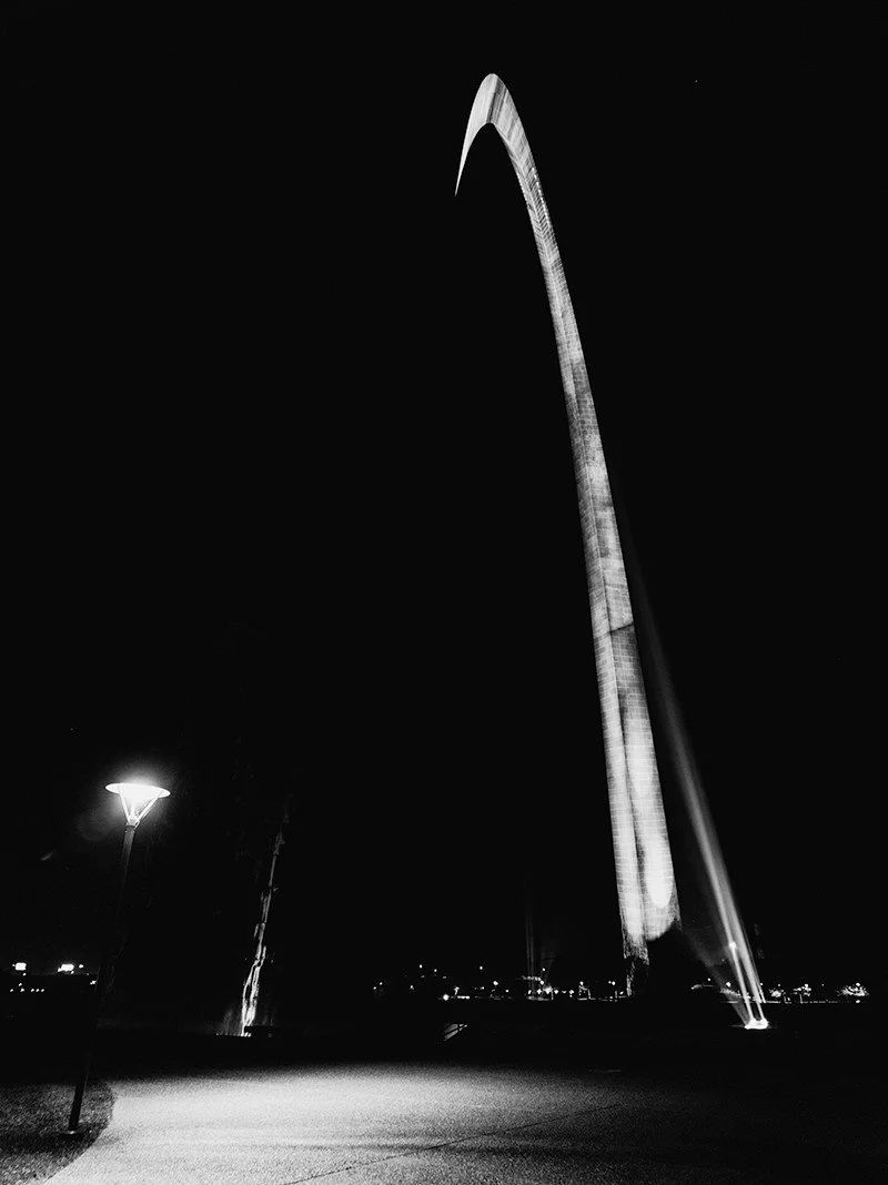 View fullsize The iconic Gateway Arch soaring into the St. Louis sky, illuminated dramatically against the darkness — a timeless architectural landmark captured in bold contrast.”