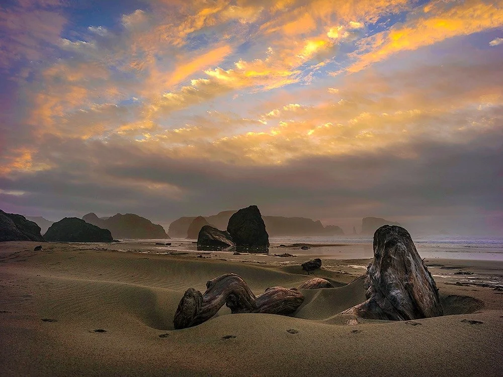 View fullsize Golden hour magic on the rugged shores of Bandon, Oregon — driftwood, sea stacks, and a glowing sky create a breathtaking Pacific Coast sunset.......#Hasselblad #X2D100C #MediumFormat #ShotOnHasselblad #HNCS #NatGeoYourShotBOTW2026