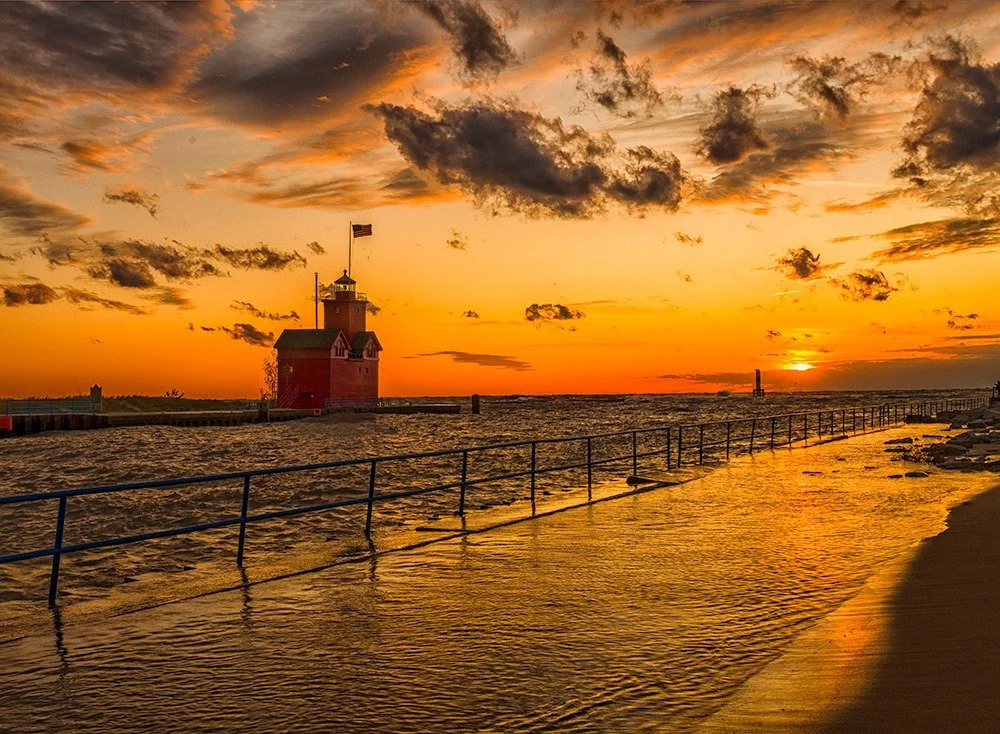 View fullsize Golden hour magic at Holland’s iconic “Big Red” Lighthouse, where Lake Michigan meets the sky in a breathtaking sunset view. 🌅✨