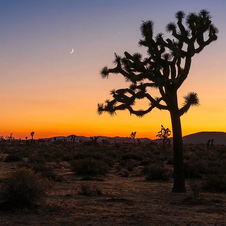 View fullsize Golden hour over the Mojave Desert with iconic Joshua Trees silhouetted against a glowing twilight sky – a serene glimpse of California’s wild beauty