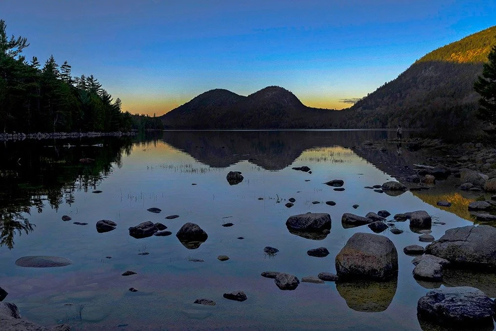 View fullsize Sunset tranquility at Jordan Pond in Acadia National Park — crystal-clear waters, rocky shoreline, and the iconic Bubbles reflected in perfect stillness...#leicaphotography