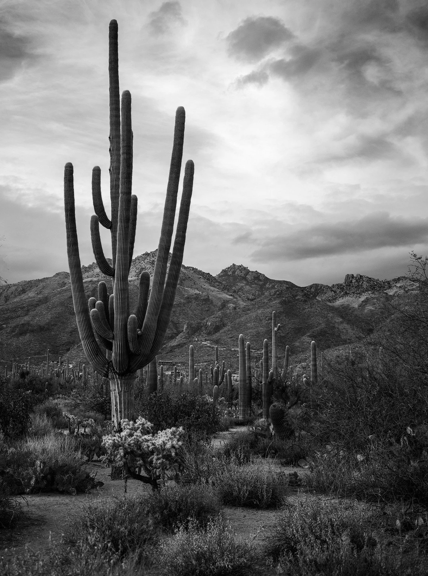 View fullsize Majestic saguaro cacti rise against the dramatic desert sky in Sabino Canyon, showcasing the rugged beauty of Tucson’s Sonoran Desert landscape.