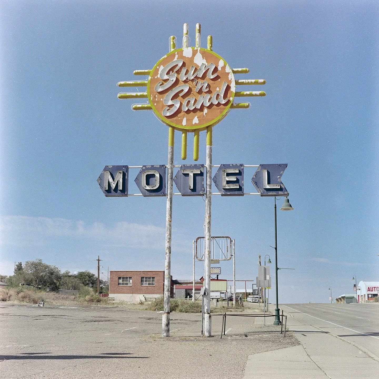 View fullsize Faded glory of the American Southwest — the vintage Sun ’n Sand Motel sign stands as a nostalgic reminder of Route 66’s golden age.