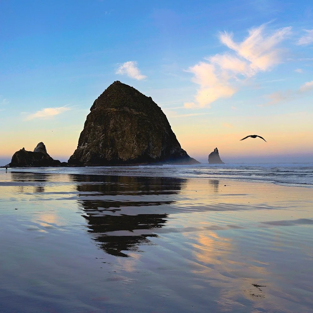 View fullsize Golden reflections and tranquil skies at Haystack Rock — nature’s masterpiece on the Oregon coast.